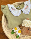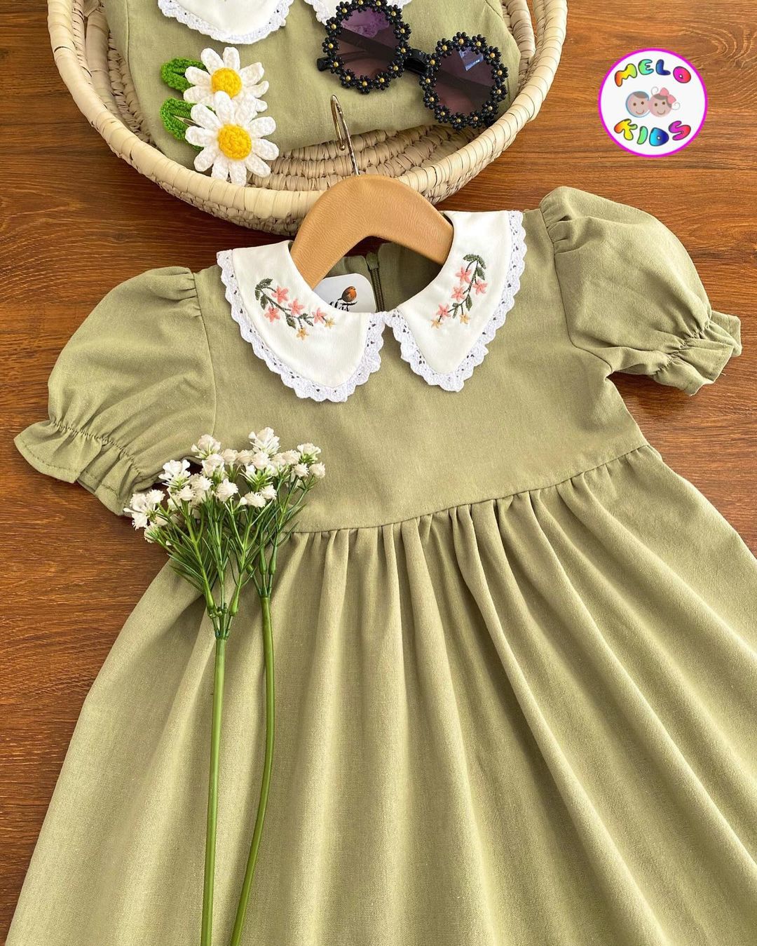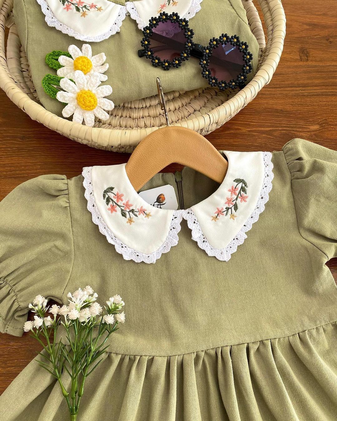 پیراهن لینن سدری یقه گلدوزی آستین چین دار