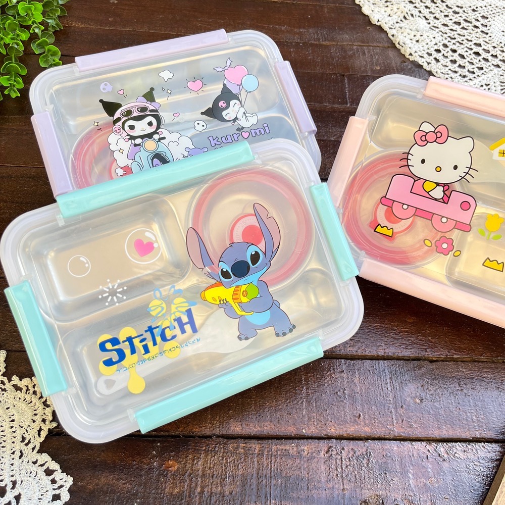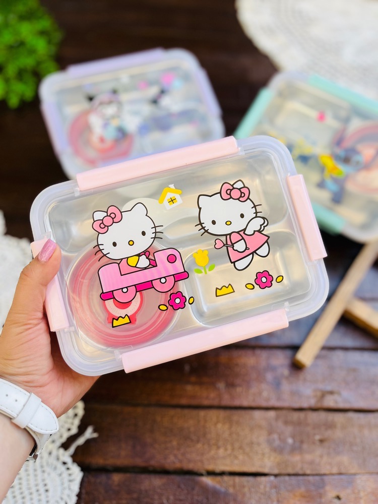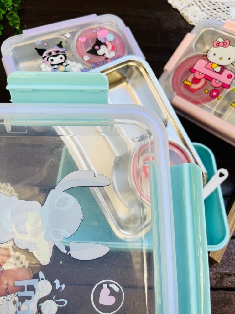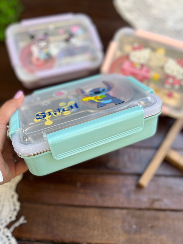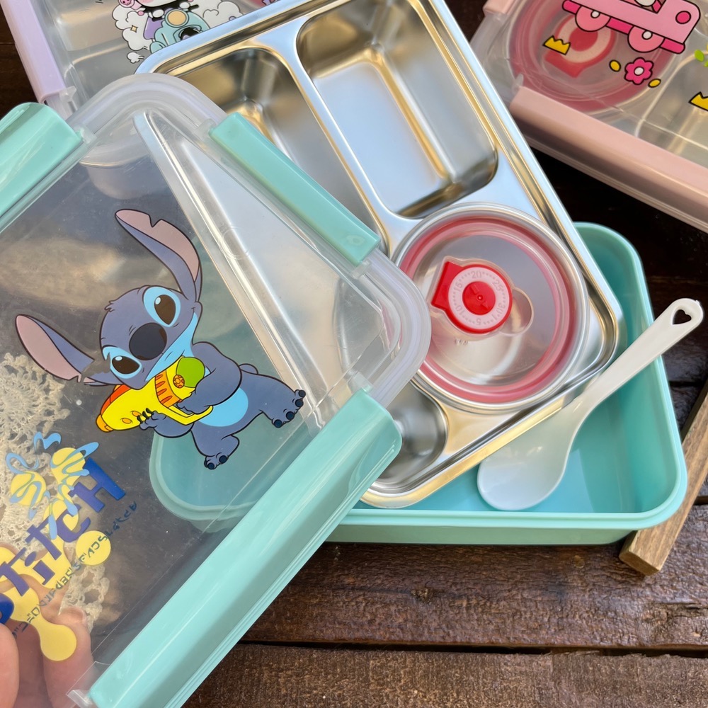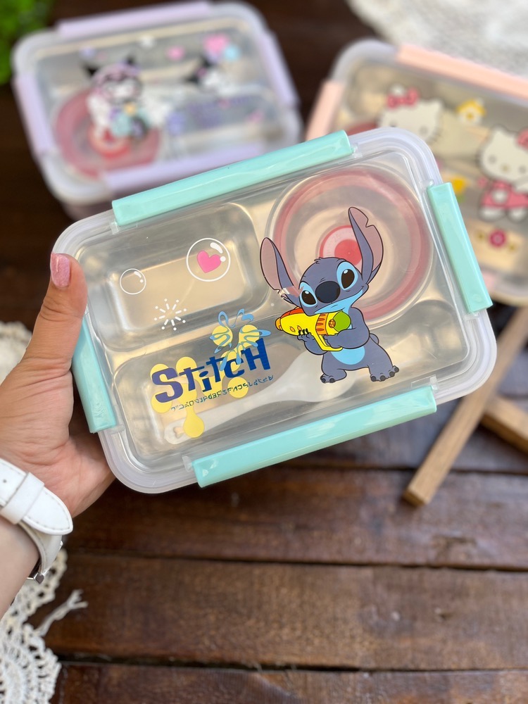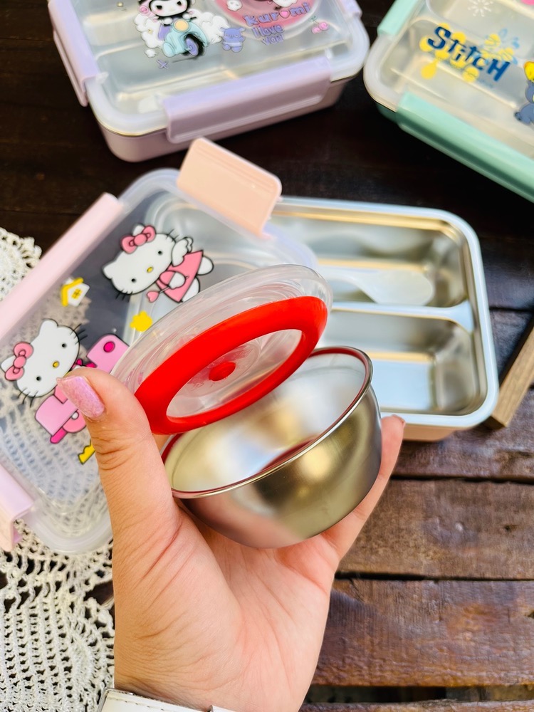 ظرف غذا مهدکودک لانچ باکس داخل استیل کاسه دار واشردار وارداتی طرح کرومی و استیچ و کیتی کد ۷۷۵