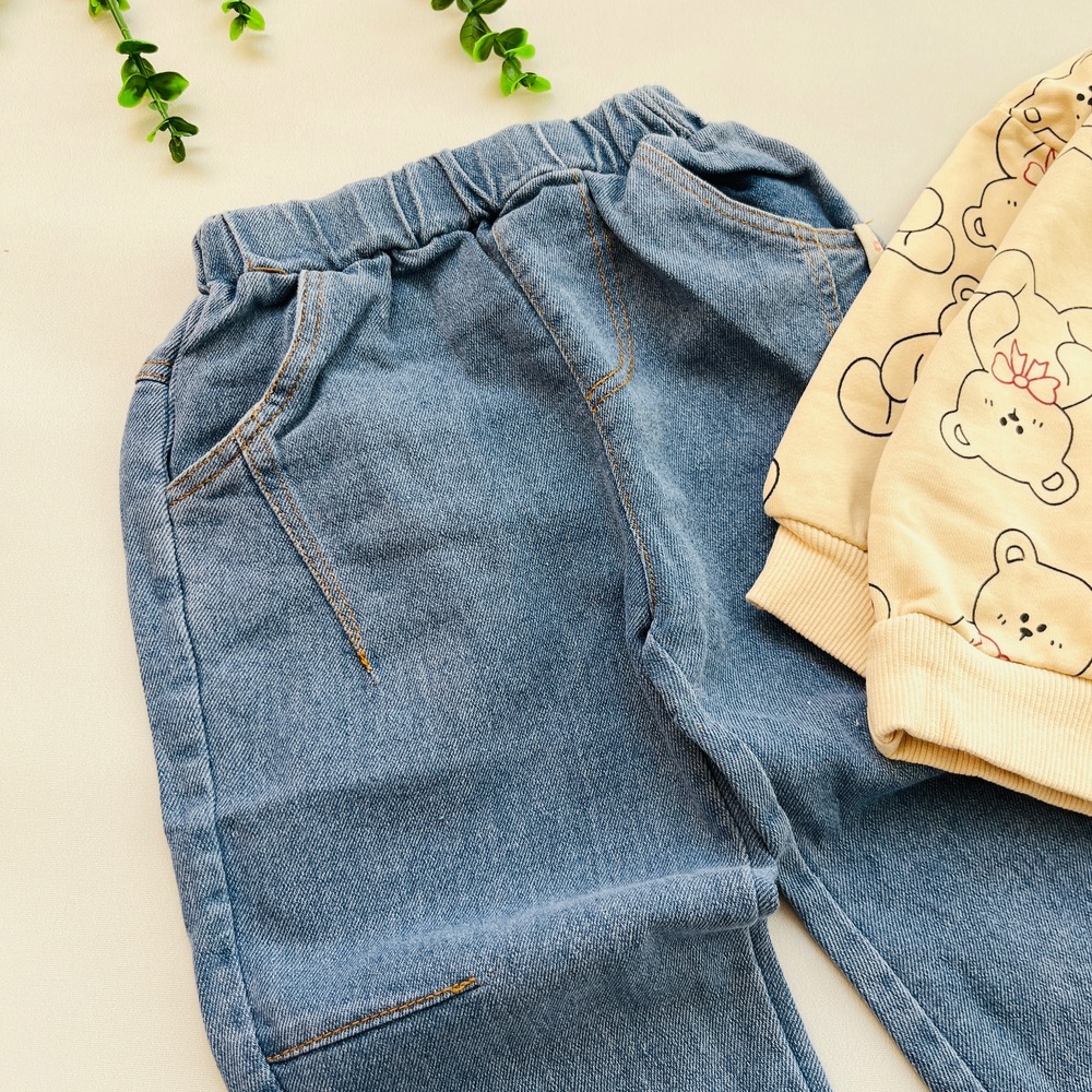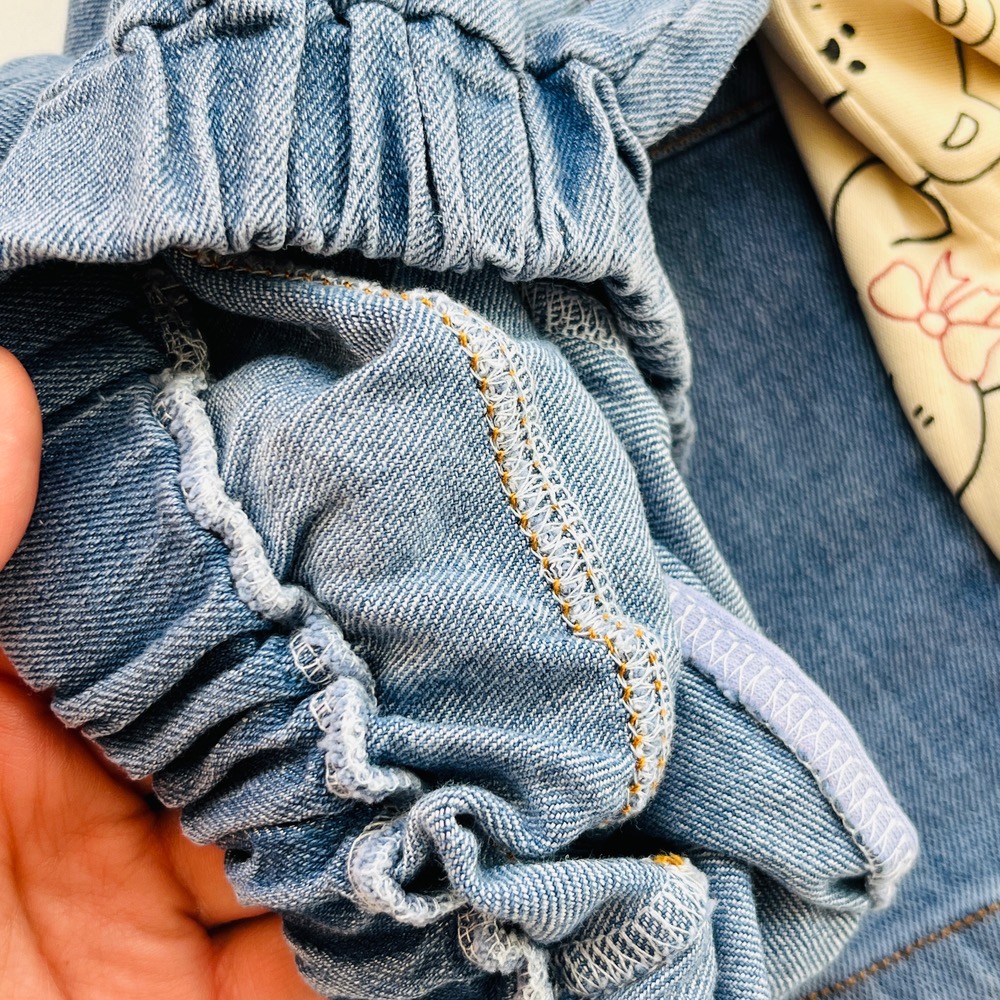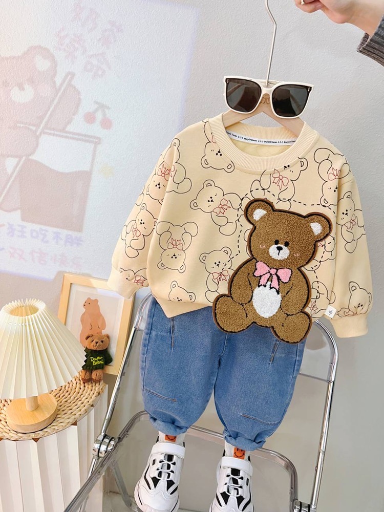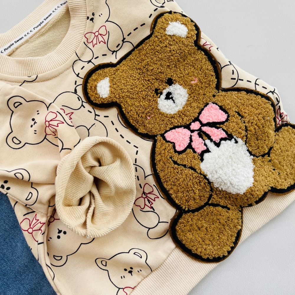 ویژگی ها: تدی پولیشی برجسته روی بلوز دوخته شده/ رنگ بلوز کرم استخونی و شلوار جین آبی